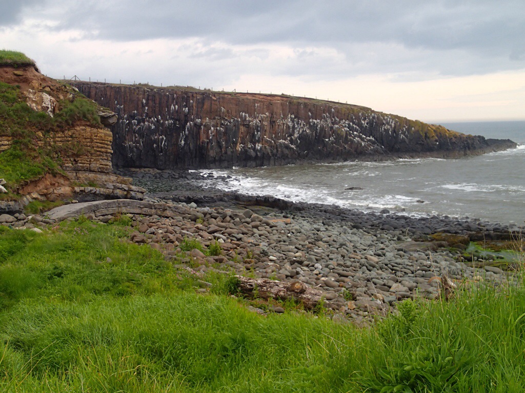 When we rejoin route 1, we find ourselves crossing Beal sluice then following narrow, bumpy paths across the dunes, sometimes along stretches of sea wall. Slow going, especially for Caroline on her touring bike, with relatively thin tyres. The last stretch into Berwick is along the cliff edge with some gorgeous views in the early evening sun, but would not have been fun in the rain – the narrow, rough path goes very close the edge where material has slumped into the sea. The cliffs here are beautiful red sandstone – the same we noticed appearing as building material during the day.