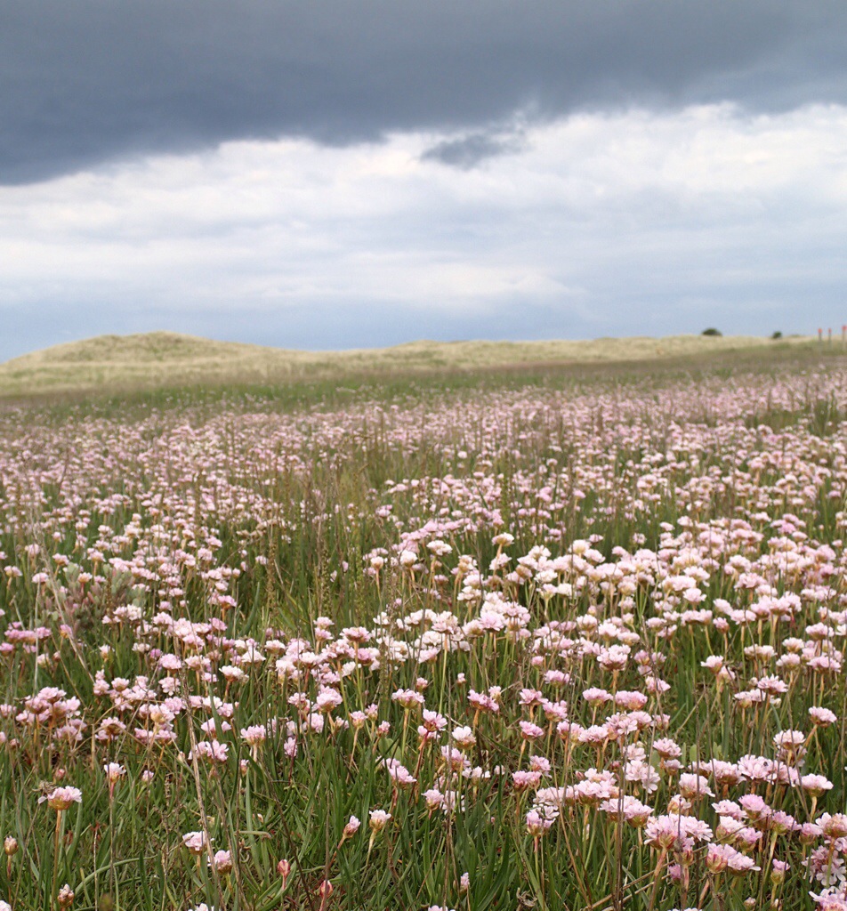 After lunch we loop round to Bamburgh then inland round the pretty village of Belford on the other side of the A1. Lots of quiet lanes with verges full of cow parsley, which smell lovely after the rain, and beautiful views of Holy Island in the late afternoon sunlight. Judging by the roads, the Romans definitely made it here. This is also the first time we meet lots of other cyclists, crossing paths with one group repeatedly as we stop for photos at different times. We get back to the A1 at Beal for a welcome afternoon cup of tea at the Lindisfarne Inn, then take a little diversion from our route to ride across the causeway to Holy Island. It is nearly 5pm by this time and the end of the safe crossing time today is 5.40, so we more or less just ride across the causeway and back. The expanses of flowering sea pinks on the far side are enough, alone, to make this worthwhile.