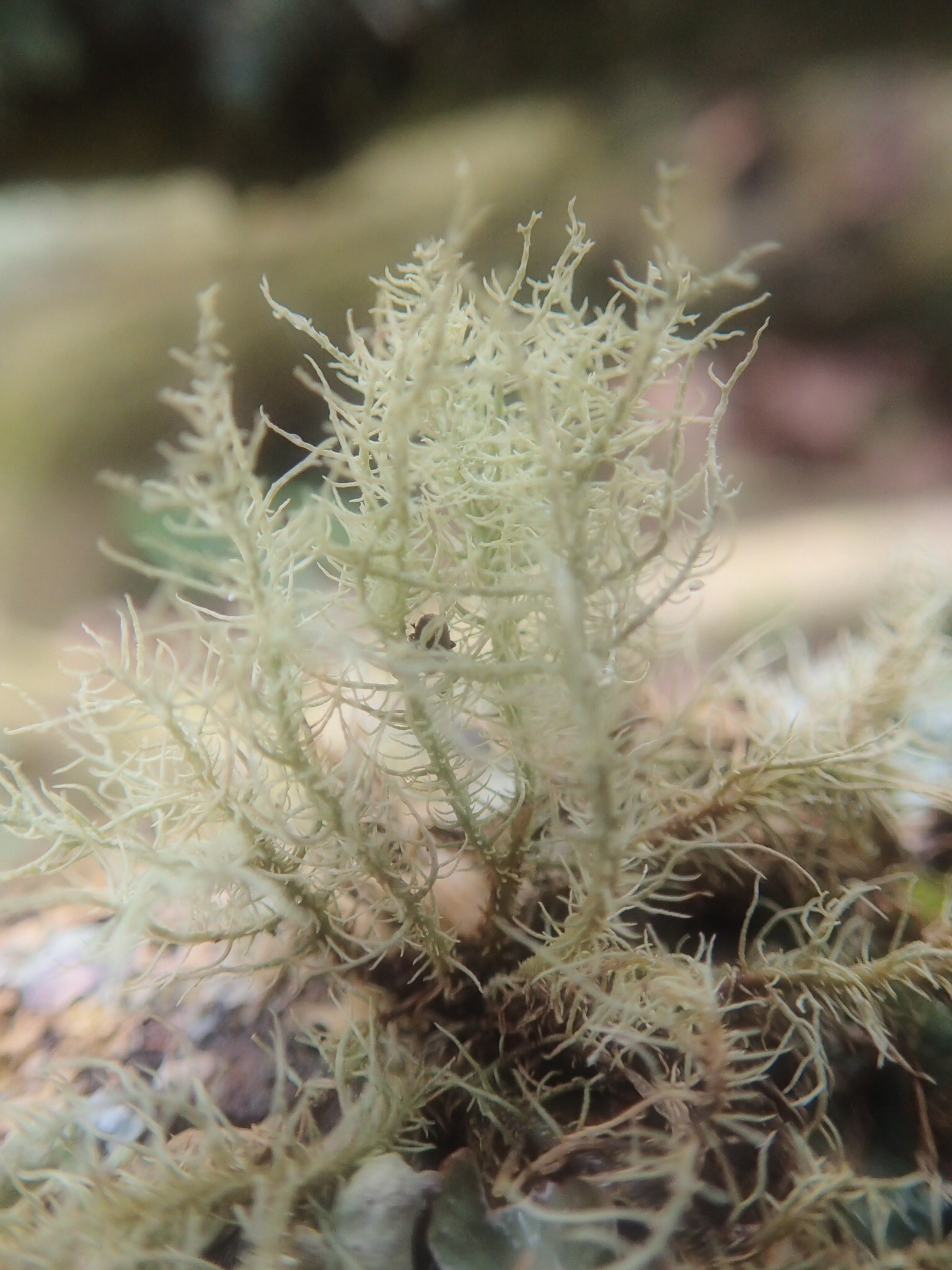 Lichens’ growth strategy means they can survive in the most hostile of terrestrial environments but they trade this advantage off against very limited potential for rapid growth in more favourable conditions. Victims of their own success, as soon as a little anchorage is produced and a rudimentary soil forms, other more raypidly growing species, such as grass and, in this case bilberry (Vaccinium myrtillus), take hold and rapidly out-compete them.