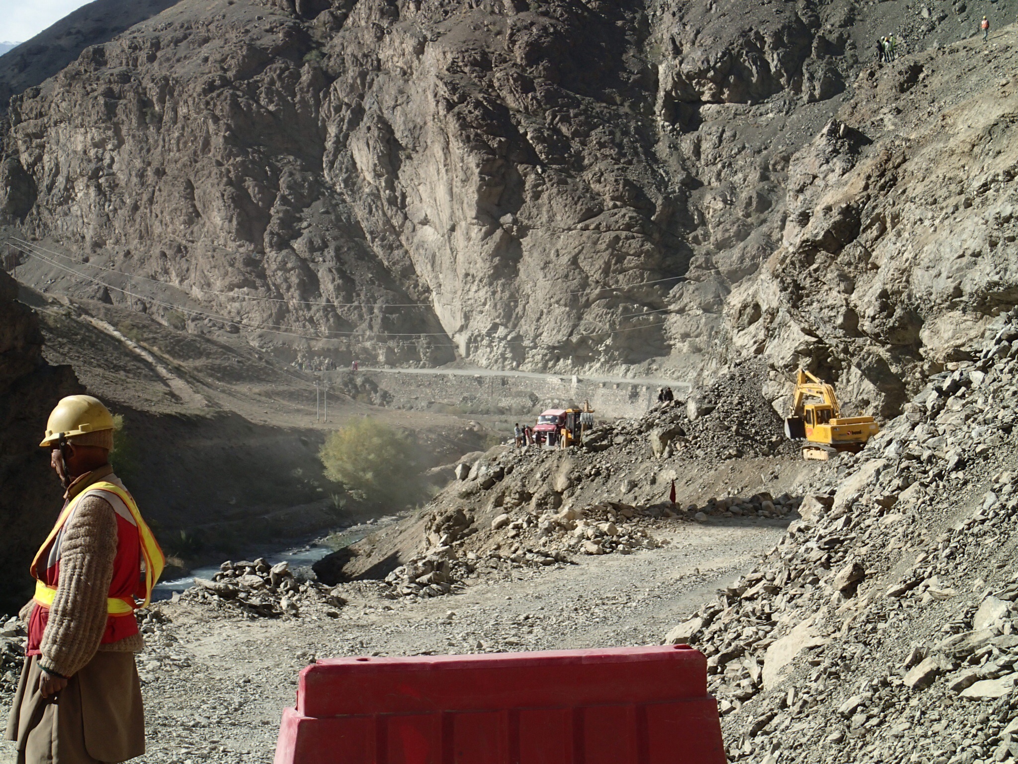 Many look quite like meerkats on their hind legs to me! Unfortunately, I get stung on the neck by a wasp while we eat. Many of the Indus tributaries we drive along today are dry – Tashi says they will have water in during the monsoon. We wonder whether they are dry more of the time now than they were in the past as they are marked as proper rivers on our maps. Not long after Mulbek, on a much rougher section of the road, we join a shortish queue of stationary traffic. When we get out and investigate it’s clear it’s not going to be a short wait – it turns out to be about 90 minutes, but this is a lot better than last time I got stuck behind a landslide on this road…. Then we were in a rickety bus and had to sleep on it overnight while men with shovels cleared the debris. This time, apparently, they are doing road improvements. They have blasted material from an overhanging rock and are clearing it down into the river gorge using two diggers.