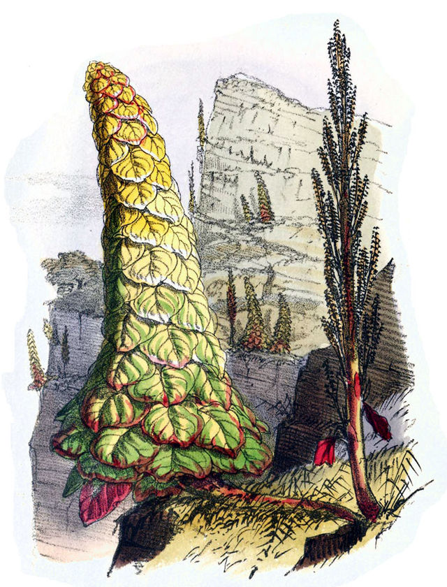 Hooker’s scene showing Rheum nobile in its natural environment.  Image licensed under public domain.