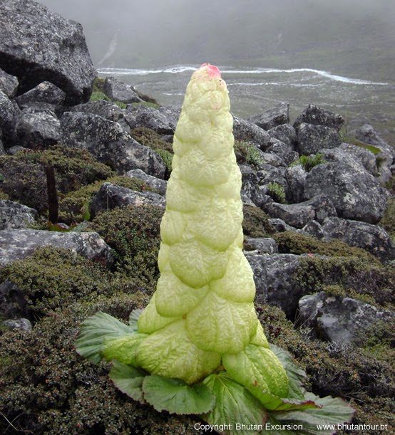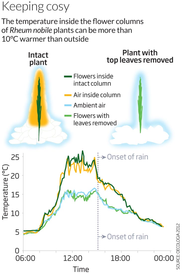 I’ve mentioned the bizarre-looking Rheum nobile before in a blog but a reference to a New Scientist article about it by Henry Nicholls piqued my interest again. Most plants growing where Rheum does, at altitudes of 4000 to 4500 m, hug the ground to avoid the cold and wind, especially given the lack of soil to give them a decent foothold. However Rheum nobile has a strategy all its own which allows it to grow up to two metres high in this unpromising environment – it grows it’s own greenhouse!