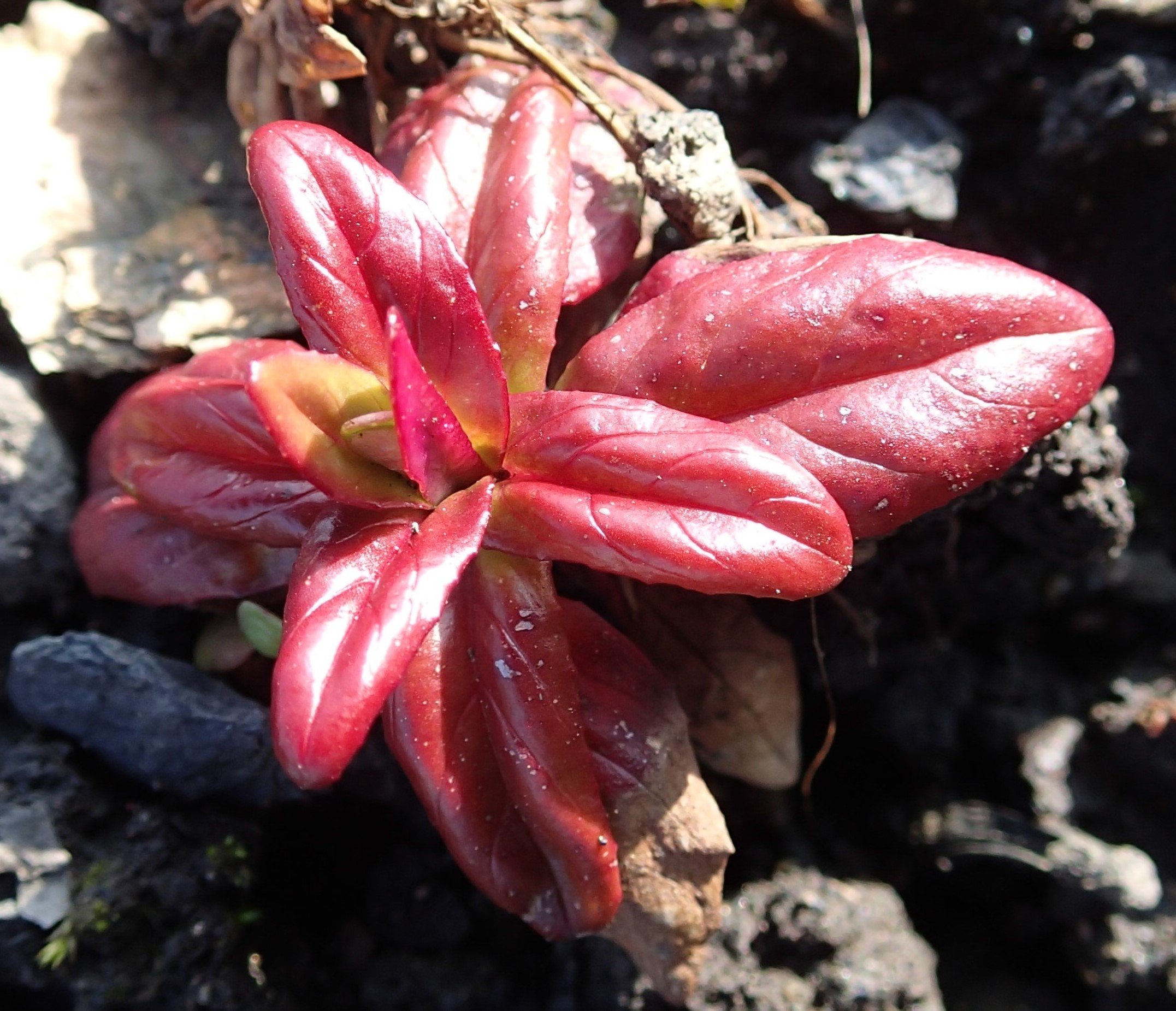 You don’t need to go all the way to the Himalayas to see plants under stress from high light levels, particularly early in the year. Enjoying the first really warm sunny afternoon in my allotment today I noticed the bright red leaves of some of the tiny willowherbs I was attempting to get rid of.