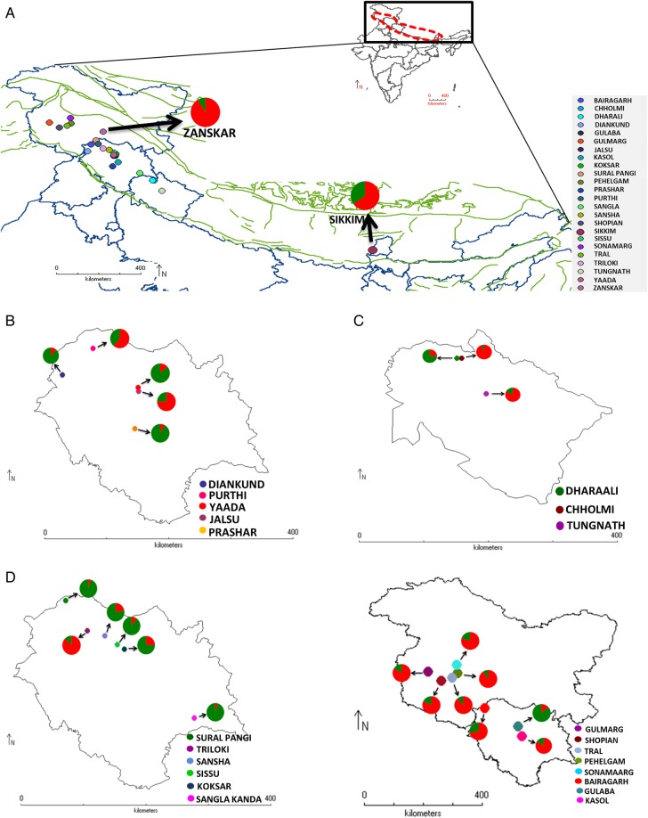 Nag and his colleagues sampled 209 individual plants from 24 geographically-isolated populations in India alone.  They assessed the genetic variability of P. hexandrum within these populations using amplified fragment length polymorphism (AFLP) markers, with a view to using this information to both inform conservation strategies and predict how the plant will respond to changing climatic conditions in the region.  What they found was that all the individuals fitted into two major groups or genetic populations but that these two genetic populations were intermixed, in each location, with significant gene flow between them – the result of widespread seed dispersal by herbivores and birds.  The red and green proportions of the pie charts in Fig.1 (below) indicate the proportion of each genetic population in the areas sampled.  In some areas, largely Zanskar, Sikkim and the Pir Panjal range, the ‘red’ population predominates, whereas in other areas the ‘green’ one does.