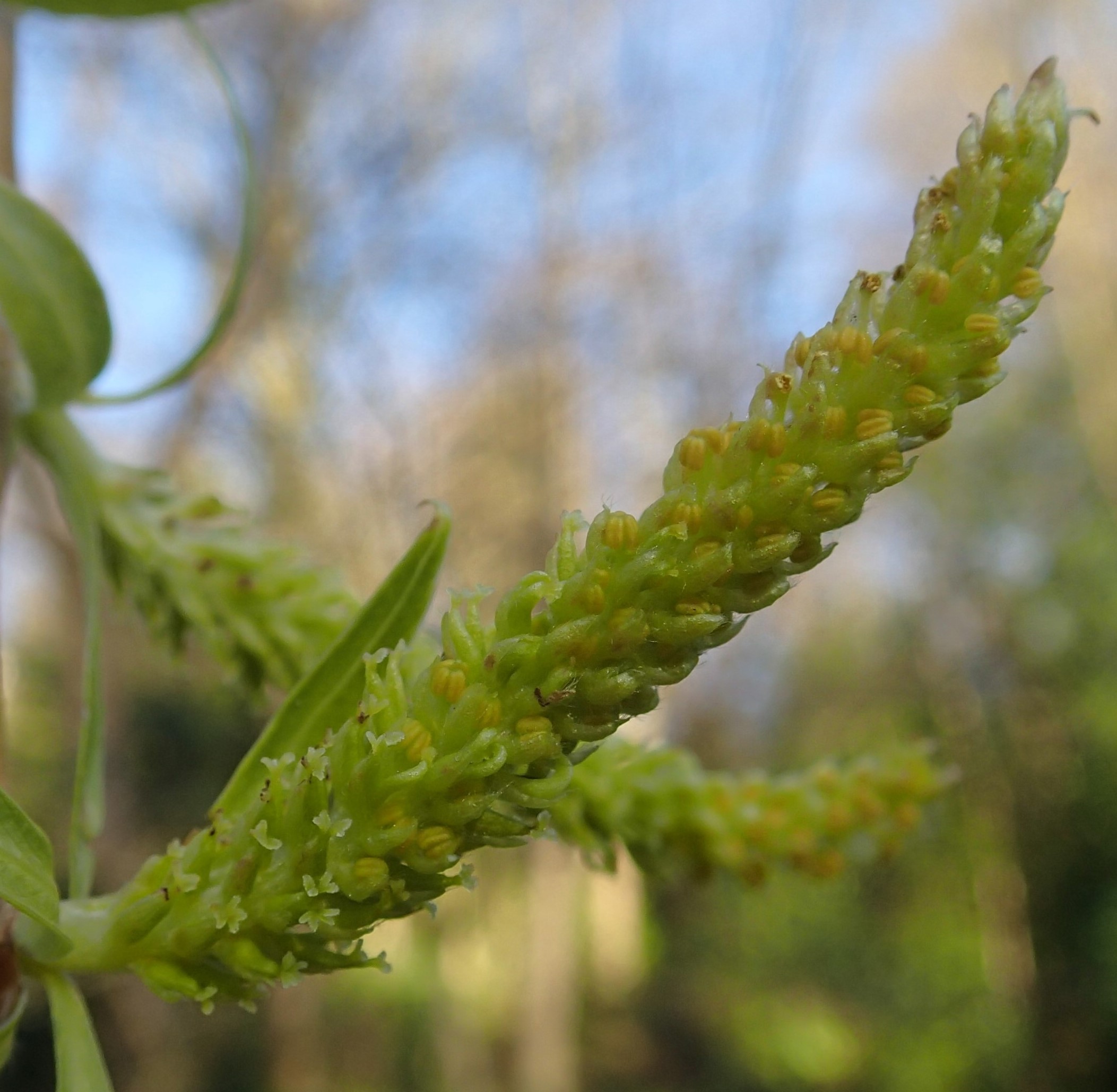 So far, so good. But my tree books says that all willows are dioecious, i.e. the male and female flowers are on separate trees. Weeping willows seem to be the exception which proves the rule! The catkins normally hang down more or less vertically on the tree, so having the male flowers at the far end means the pollen from these is not likely to end up on the female flowers in the same catkin, improving the chances of cross pollination.