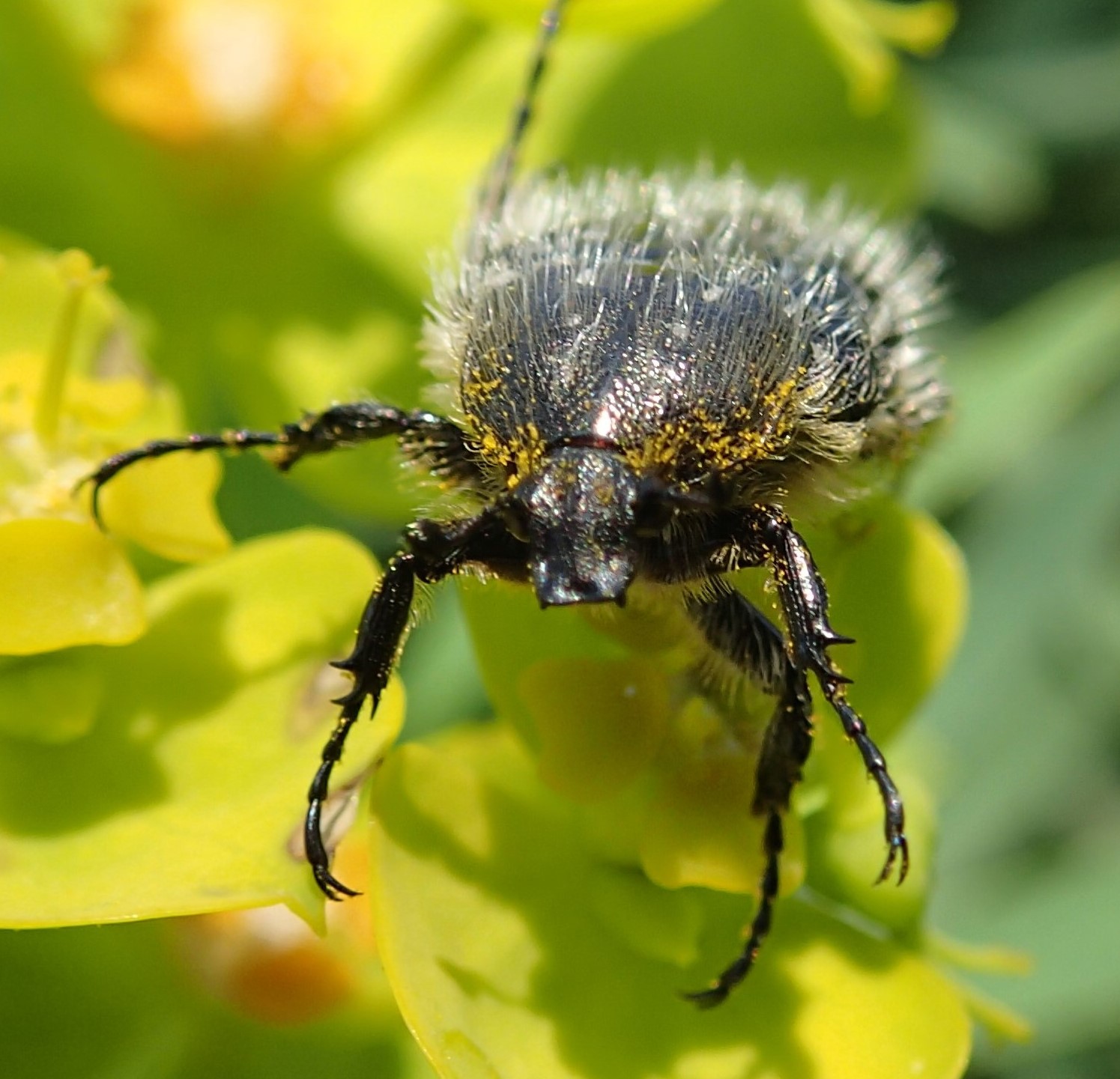 Having thought quite a lot about pollinating insects recently (see ‘Why are flowers pretty?’) One thing that surprised me on holiday in Malta last week was the range of plants I saw being pollinated by the same beetle. From Euphorbia dendroides (Tree spurge) in the Argotti Botanic Gardens to all manner of wild flowering plants – Compositae, legumes, lilies and umbellifers – we seemed to see these white-spotted black beetles, fringed with hairs, with their heads in flowers everywhere. Yellow pollen was clearly visible trapped in the hairs on their sides and backs and must be transported freely between the plants they visit. However the beetles appear to be quite promiscuous in what they choose to visit – there is clearly no special relationship with a particular type of flower here.