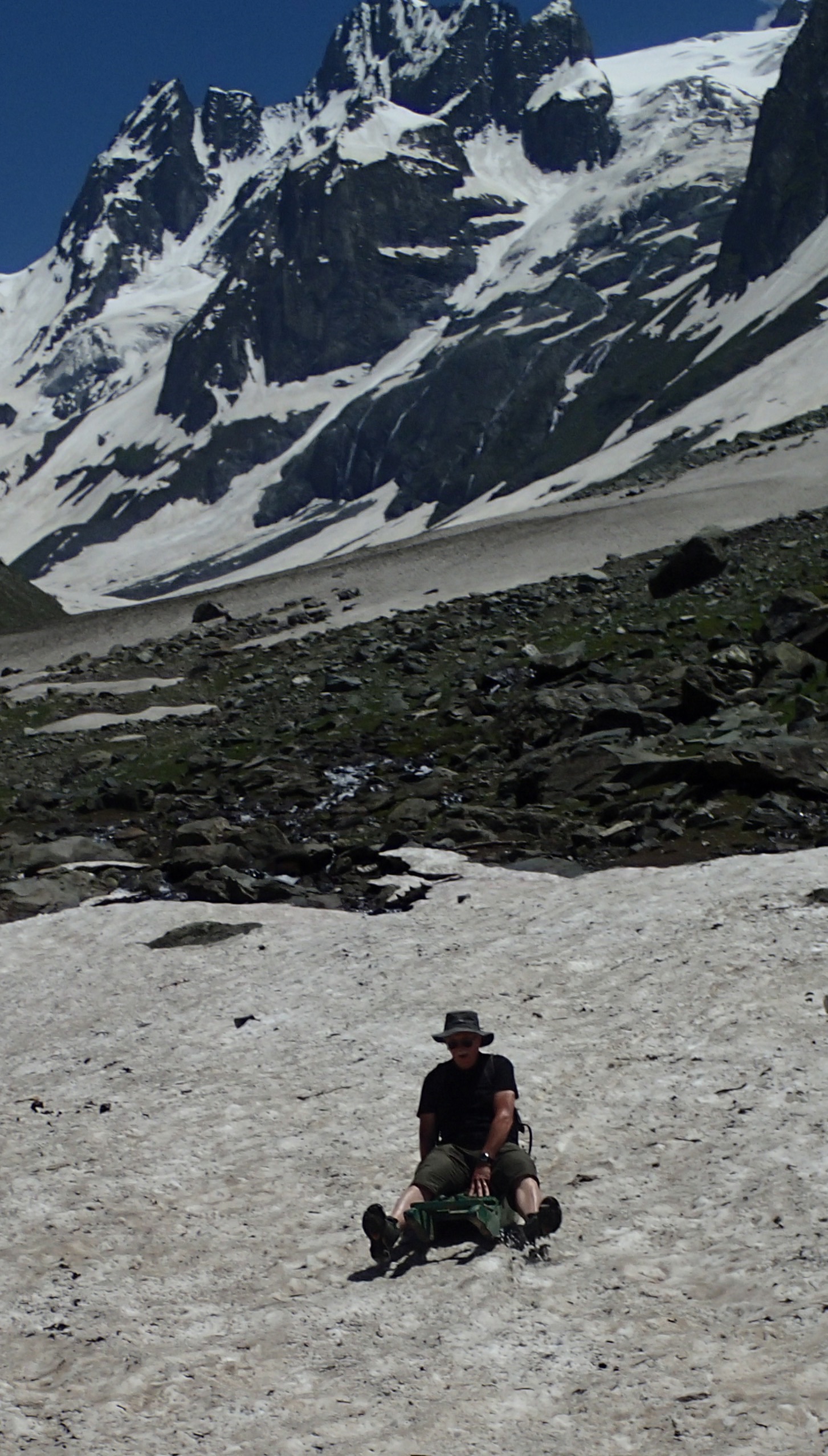After lunch some people had had enough, so ambled slowly back.  The rest of us carried on up the valley, at a variety of different paces.  When we reached the main snow pocket, John and I had a go on a sledge we found abandoned – my steering skills seem to have deserted me and I had to jump off before ending up in the river!