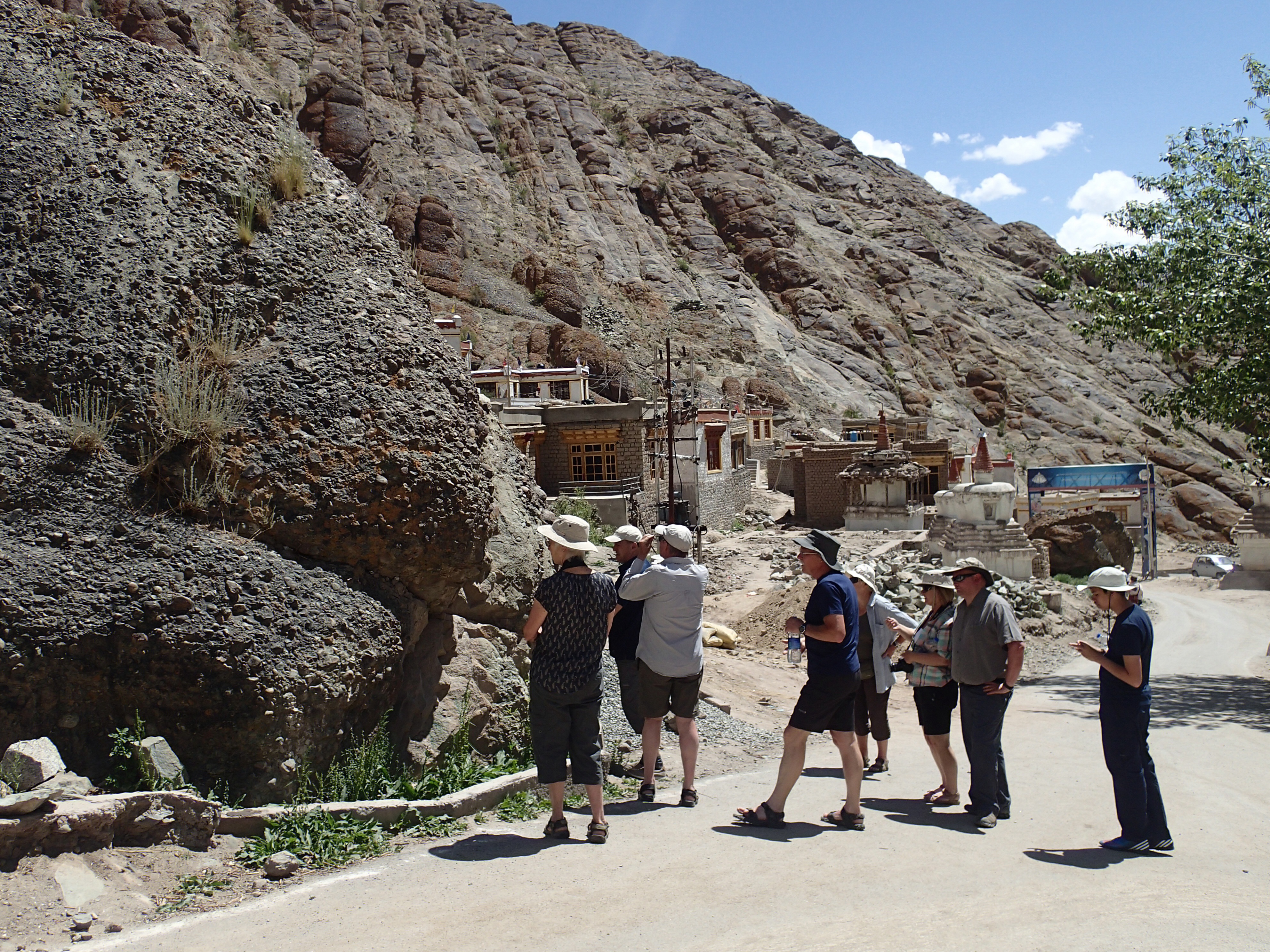 As with Shey and Thiksey, Hemis was much busier than last September, but is big enough to absorb a lot of people and still have lovely quiet corners. It also has a very interesting museum – a slightly random assortment of artefacts, but with at least some explanation. Amongst the most beautiful were travelling cases in wood or paper mâché made to fit the objects they contained precisely, be these tea or coffee pots or ceremonial cymbals. The most entertaining was a travelling box for LPs – the record on display was ‘Wine, Women and Song’, ironically for monks! No photos allowed in the museum, sadly.The location of Hemis is spectacular and John used the opportunity to talk about the conglomerates of the Indus formations on which it sits. On the way down we also stopped to look at some of the lichen covered boulders.
