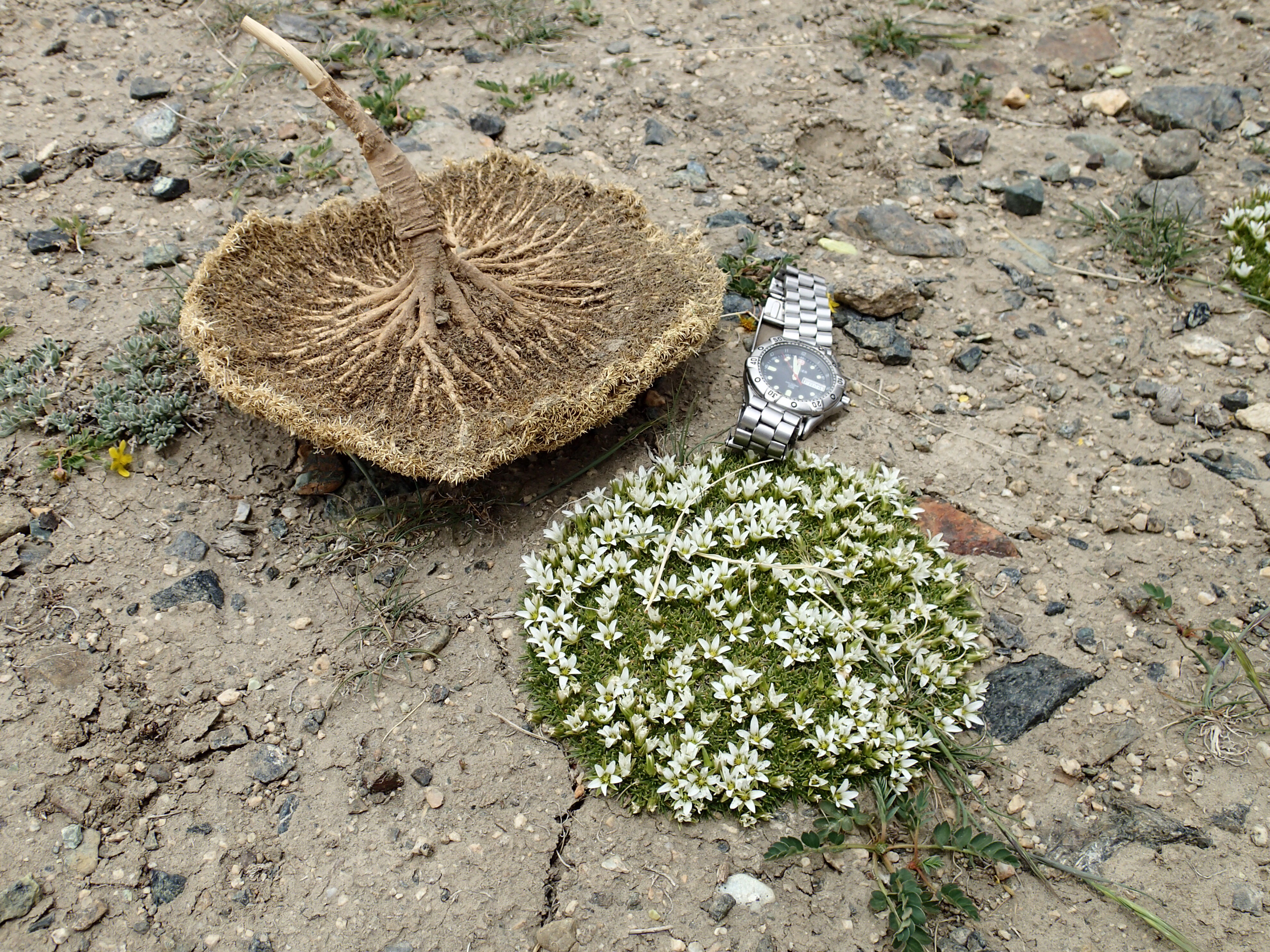 We had a look at some of the saxifrage cushion plants and were able to show that the temperature at the centre of the cushion was always a degree or two less than on the outer edges, protecting the meristems from overheating at this time of year. We found some uprooted cushions too and it was intriguing to see how they are attached to the ground by a single, robust tap root.