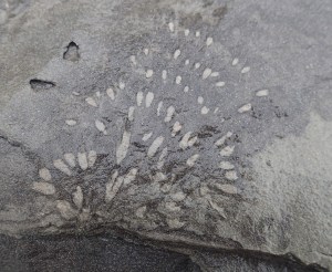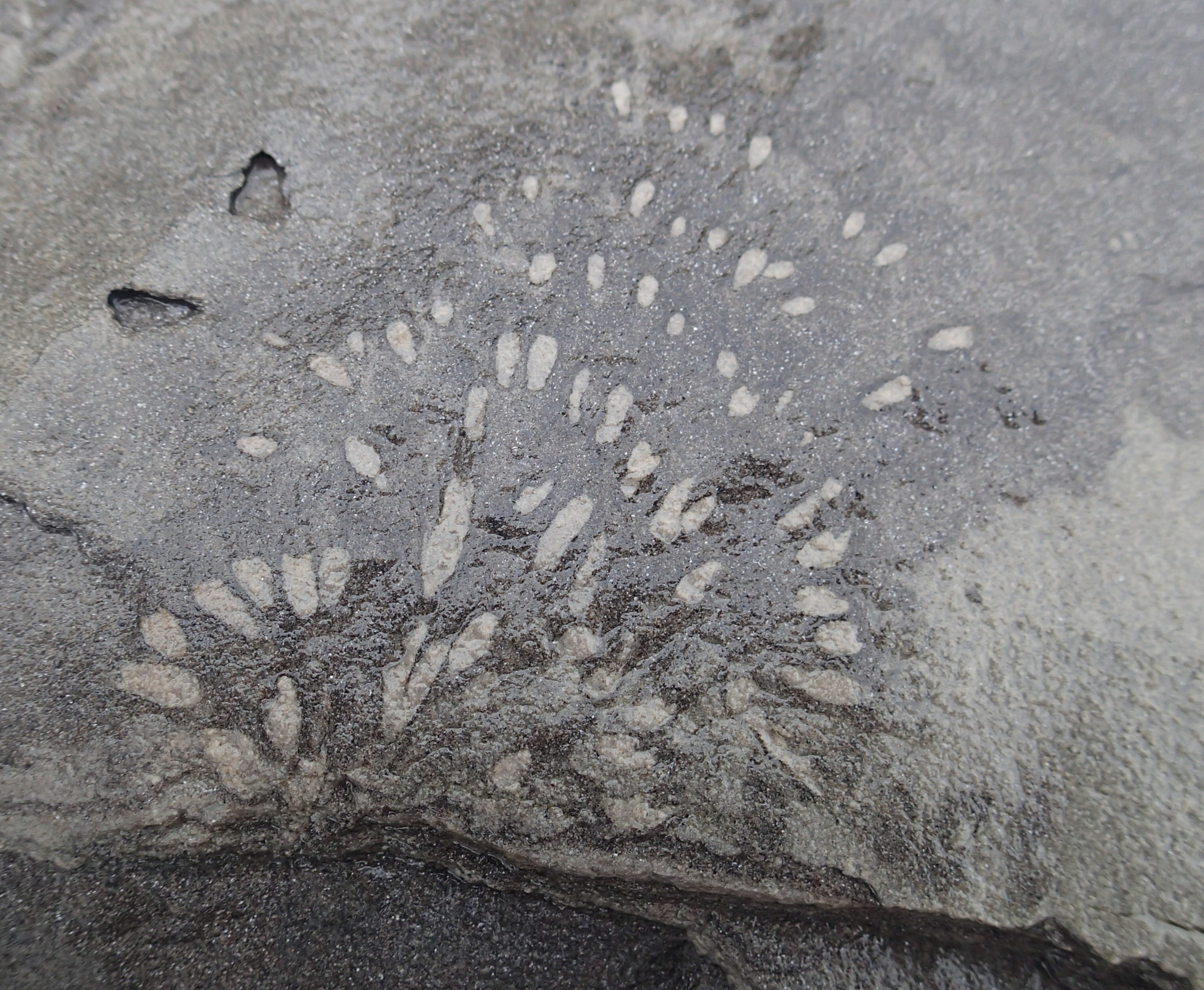 Some of these sedimentary layers are rich in fossils – both trace fossils of burrowing animals such as Eione and fossil crinoids, corals and plant material.