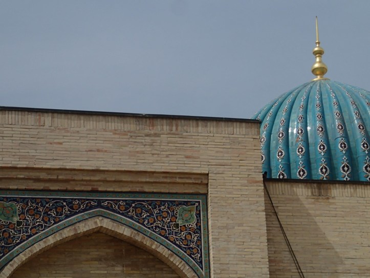 As we walk along Zarkaynar road we get occasional glimpses into shady courtyards.  Many of the houses here are made of wattle and daub and survived the 1966 earthquake.  When we reach Hazrat Imam mosque we are surprised, initially, by how modern it looks.  That is, until we read that it was built in just four months in 2007 on President Karimov’s instruction.