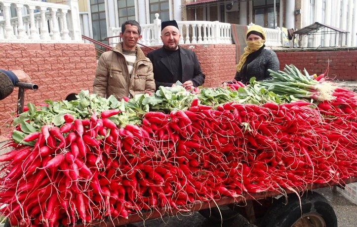 Eggs, spinach-stuffed bread and radishes for sale in Chorsu Bazaar