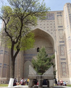 At least, from this vantage point, we can get our bearings better and we head for the Bibi Khanym mosque and mausoleum.  Bibi Khanym is supposed to have built the mosque for her husband, Timur, in whilst he was away terrorising northern India. Legend has it that the architect fell in love with her and was executed by Timur, on his return.  The mosque was one of the largest of its day but was, perhaps, built too quickly as much of it fell down in an earthquake shortly afterwards.  The present building was heavily restored in the 1970s but the effect of more recent earthquakes on the structure is only too apparent.