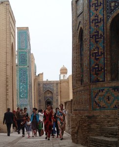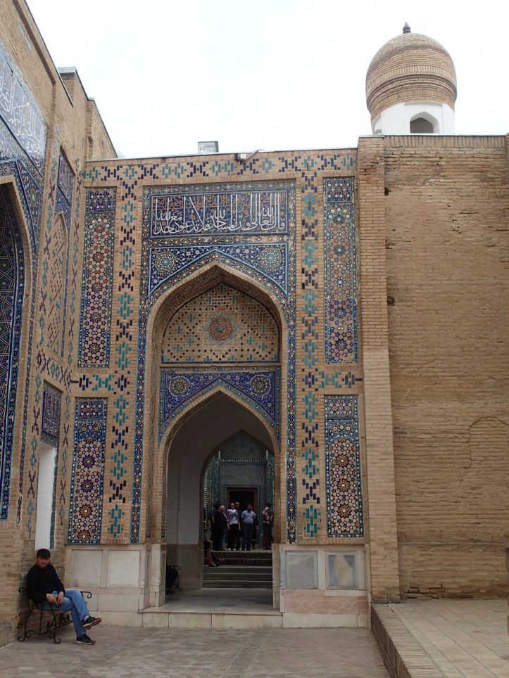 We eventually find the canteen in a separate building beside the market – one thing we notice here is that buildings often have little on the outside to advertise what is happening inside.  At least we don’t have to worry about what to order this time – we get the same as everyone else; plov, made with beef, salad and a kind of yoghurt soup flavoured with dill and mint which cuts through the oiliness of the plov well.  Suitably fed and watered we set off for the Shah-i Zinda mausoleum complex.