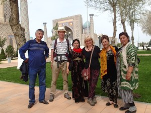 Daniel (Daniyar) is patron saint and protector of Samarkand and his remains were supposedly brought to the city, from Persia, by Timur.  Legend has it that Daniel’s severed leg continued to grow after his death so his body has been housed in a series of increasingly large sarcophagi – the current one is 18 m long.  We are only allowed to peer into the sacred building, as are the other visitors this morning – elderly Uzbek pilgrims, with their mufti.  Daniel is not just revered by those of Abrahamic faiths though – the bundle of horse hair hanging from a pole denotes the burial place of a spiritual leader of the nomads too.