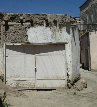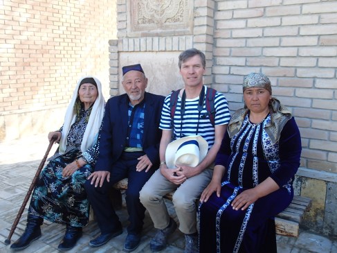 The drive through the flat countryside north of Bukhara is interesting in its own right. As usual, I’m botanising from a distance, but can’t decide whether I’m seeing rice or wheat in the fields. We see a mechanical paddle-based irrigation system at work but also elderly men and women hoeing dust-dry land by hand in the hot sun. The sky is so blue it almost hurts the eyes today.