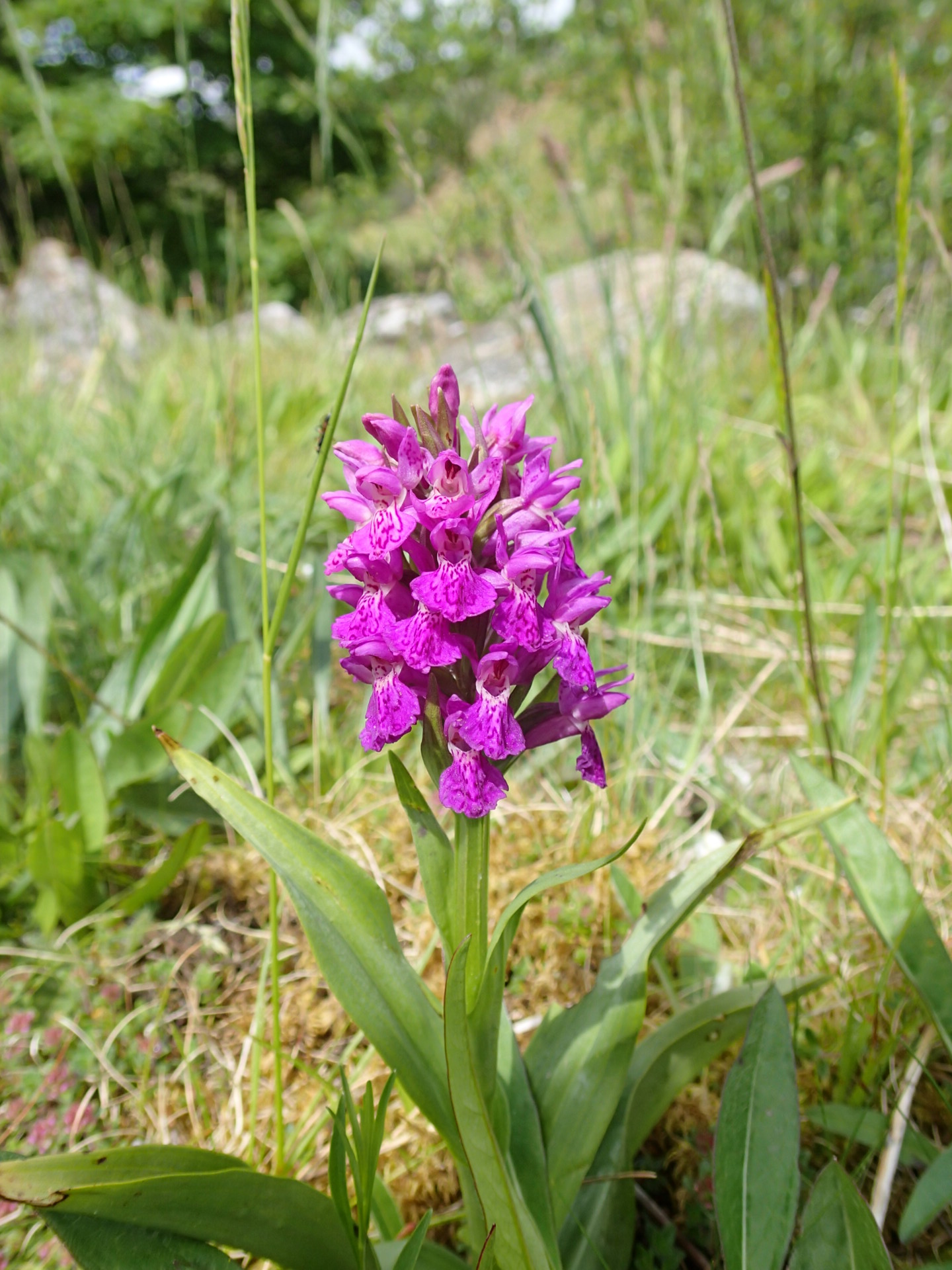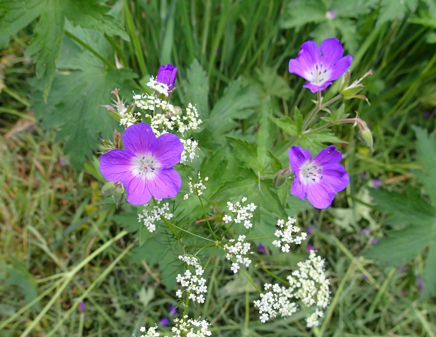 Dactylorhiza purpurella (left), Geranium sylvaticum and Conopodium majus (right)