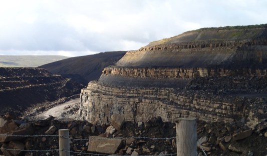 Not all the local industry is a thing of the past – the huge Heights quarry, where limestone for aggregate is still being excavated, is well hidden from the road below but cuts a huge gash in the hillside. For anyone with a passing interest in the geology of the area it exposes a long sequence of sedimentary rocks, of Carboniferous age, from the ‘Great Limestone’ at the base to layers of shale and sandstone nearer the surface – the result of fluctuating environmental conditions when the North Pennines had a tropical location that’s hard to imagine today!