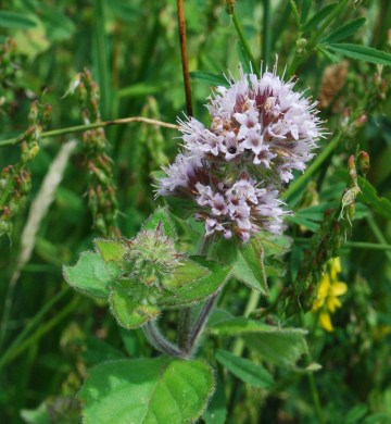 Bindweed continues to scramble through the hedgerows and comfrey to thrive but, for the first time this year, I find no White dead-nettle in flower.  I do, though, find another of the Lamiaceae, mint, flowering in damp ground beside the ponds.