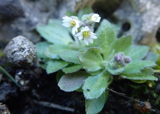 Today’s big (not really the right word) excitement for me was finally finding a plant in flower which I must have seen many times before but have never noticed. Common whitlowgrass, Erophila verna agg., is one of the earliest-flowering brassicas and so tiny that it is easily overlooked. I found it growing on top of one of the large limestone boulders which strew the slopes of the old quarry. The rabbit dropping on the left of the picture below gives a sense of scale!