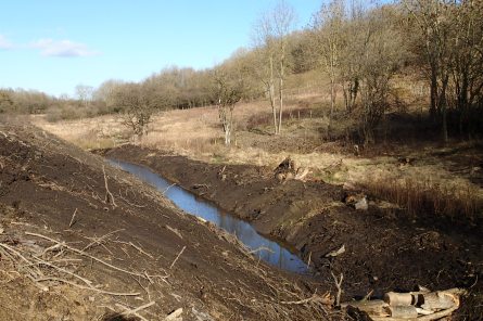 The excavation needed to start restoring the fenland area adjacent to Raisby Beck has been done since my February visit. An area of open water has been created by stripping off the topsoil and the ends of the pool created dammed loosely with some of the logged trees. It looks bald at the moment but I suspect the rich looking soil piled up beside the water will have a good reservoir of seeds, happy to be exposed to the light. I’ll be watching with interest to see what appears!