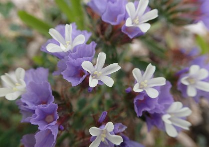 Trifolium argutum (the pink and white clover in the large photo above) has Near Threatened status in the IUCN Red list so just goes to show that a ‘weed’ is very much in the eye of the beholder!  There are other coastal specialists such as Limonium, with its distinctive white petals and purple sepals, too.