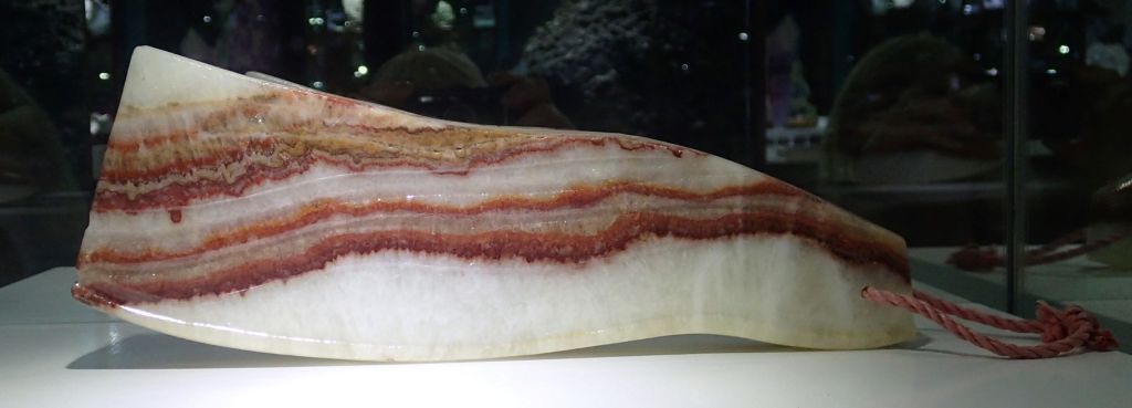 Like something straight out of groundhog day, we had to make our way back through the minor forest to the café for lunch and a much needed sit down in the shade. It was a good thing we weren’t in a hurry as a bunch of elderly men in red guard uniforms (China’s version of the Chelsea Pensioners?) appeared at the same time and were clearly the priority. The tourist stall opposite, at first sight, seemed to be selling a bizarre mixture of different rocks and minerals and chunks of bacon but, on closer inspection, these were rocks too! Calcite with iron carbonate bands, according to the label I saw later in the geological museum.