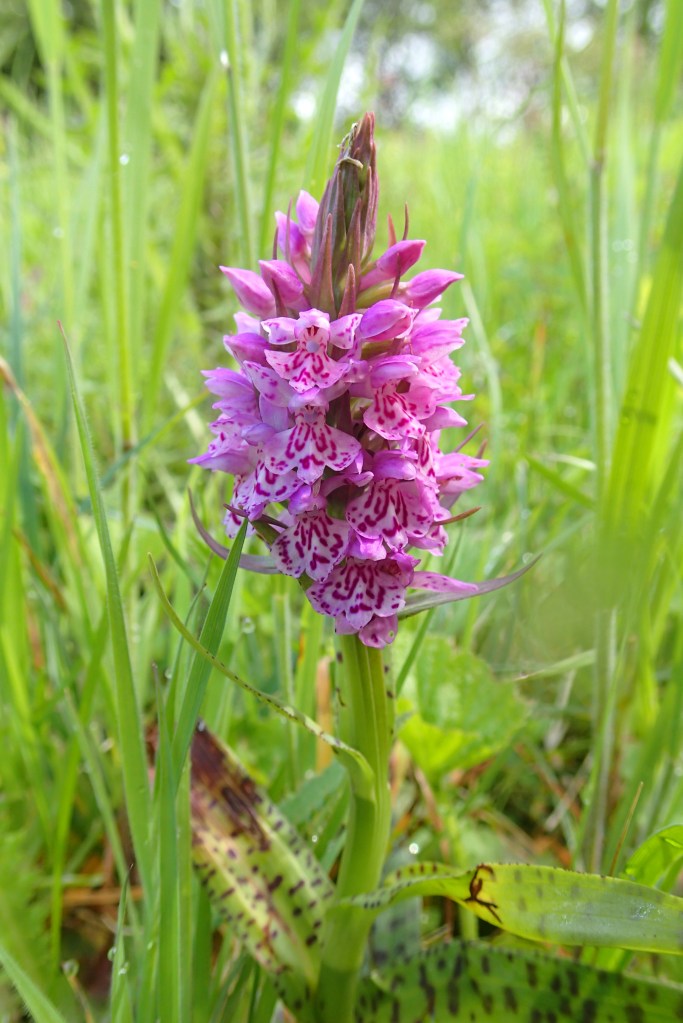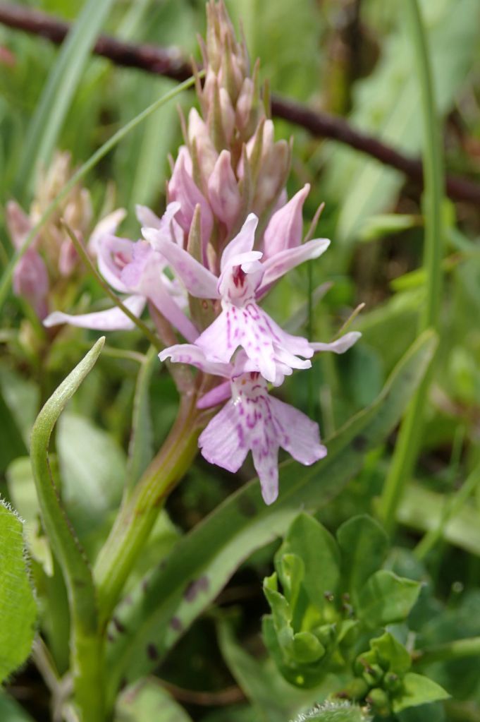 In theory, at least, the Heath-spotted orchid, Dactylorhiza maculata, can be distinguished from its relatives by its conical, becoming cylindrical, flower spikes and the fact that its lip is only slightly lobed, with the central lobe shorter and narrower than the side lobes.  This lip is covered in streak- and loop-like markings.  The Northern marsh-orchid, D. purpurella, as its name suggests, has a somewhat shorter spike of deep purple flowers covered in crimson streaks and this time the middle lobe of the lip is longer than the side ones.  Both species are largely pollinated by bumblebees but don’t provide a nectar reward for the bees – instead they rely on the their conspicuously-coloured flowers to attract pollinators.