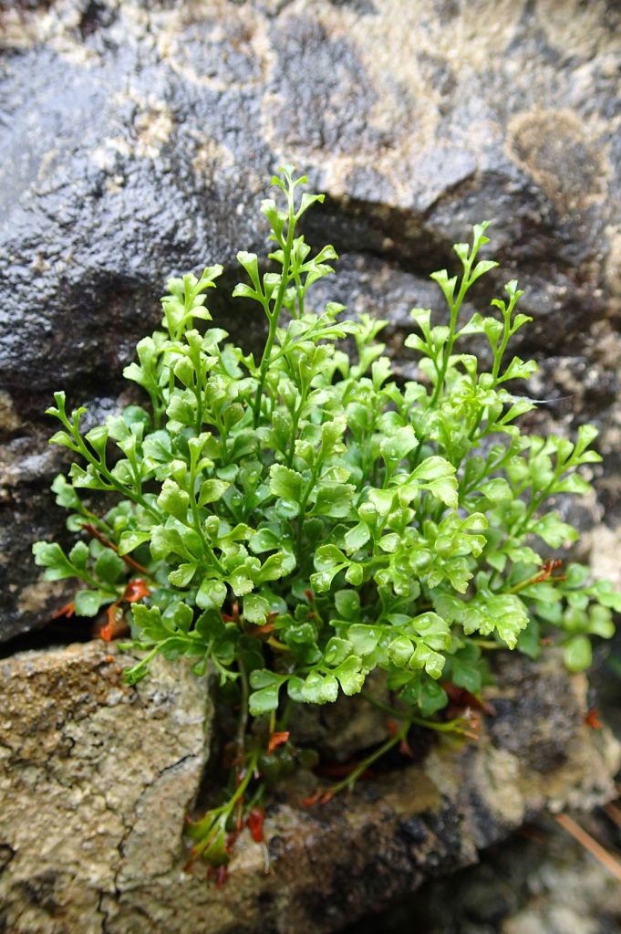The other small ferns we found growing on stone walls and in the grikes of limestone pavement on Warton Crag and Gait Barrows were both spleenworts – Maidenhair spleenwort, Asplenium trichomanes, and Wall rue, A. ruta-muraria. We can see the spore producing sporangia clustered into linear sori on the underside of the Wall rue pinnules – these will darken to a rusty brown colour later in the season as the spores inside them mature, ready for release. These linear sori are both one of the features of this family of ferns and the source of their common name. According to the 15th and 16th Century medical practice of ‘Doctrine of Signatures’, a plant could be used to treat ailments of that part of the body which it resembled, in this case the blood-filtering spleen.
