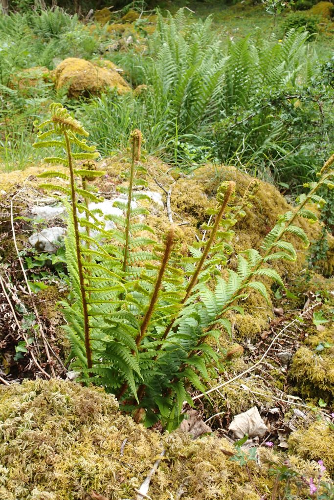 The other ferns we identified belonged to two different genera of the Dryopteridaceae family – Dryopteris (Male ferns)and Polystichium (Shield ferns). Both genera have bipinnate fronds; that is, the leaflets or pinnae into which the fronds are divided are then further divided into pinnules – effectively pinnae on pinnae. The easiest way to distinguish between these two genera is by the shape of the pinnules. In Shield ferns, these have one prominent thumb-like lobe at the base and the pinnule lobes are sharply-pointed whereas in Male ferns the pinnule lobes are only serrated and they lack a conspicuous ‘thumb’.