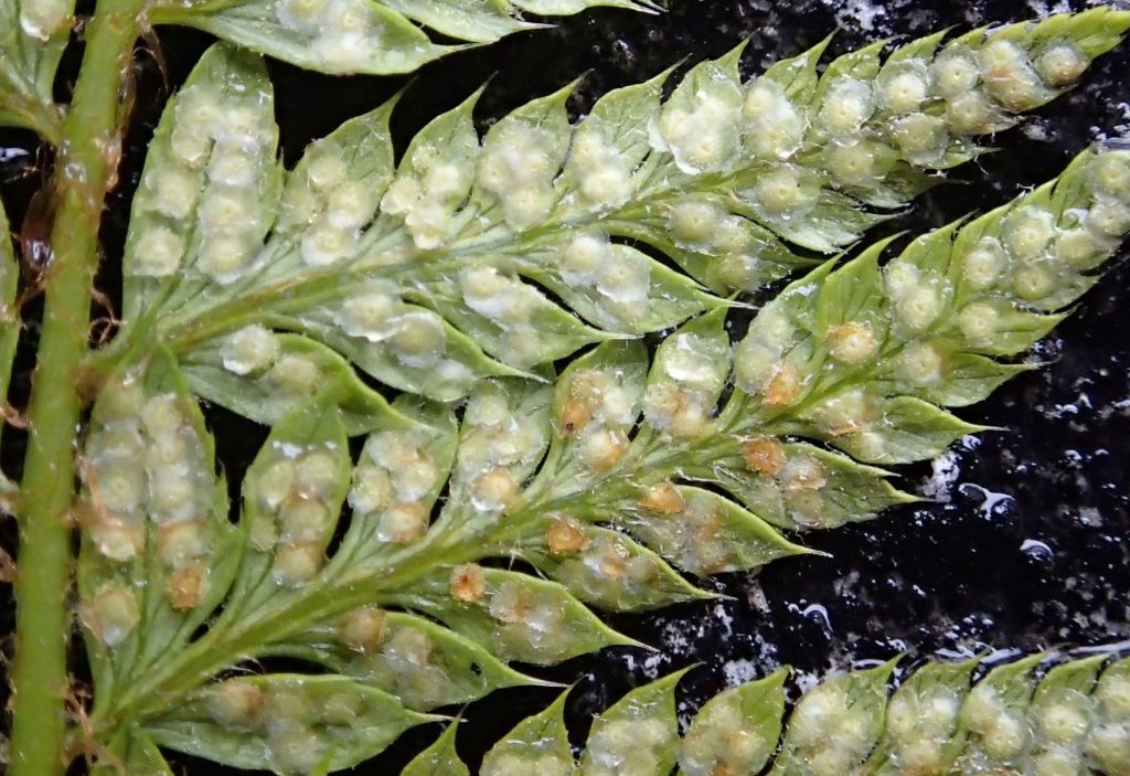 Polystichum aculeatum frond and pinnae – note the distinct ‘thumb’ at the base of each pinna (leaflet) and the spike at the tip of each pinnule.