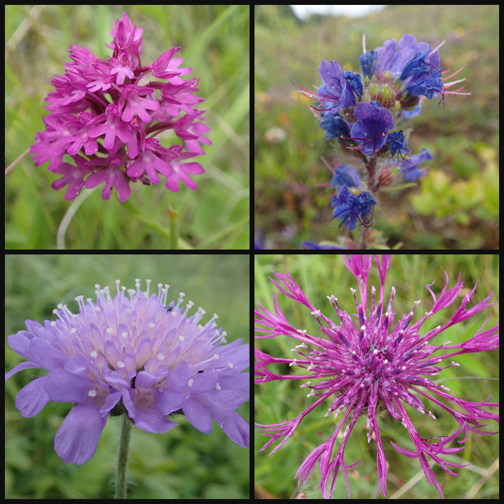 Clockwise from top left: Betonica officinalis, Campanula rotundifolia, Linum catharticum and Centaurium erythraea