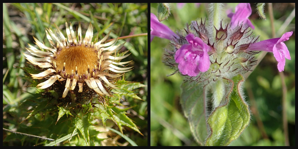 Left: Carline thistle, Carlina vulgaris; Right: Wild basil, Clinopodium vulgare