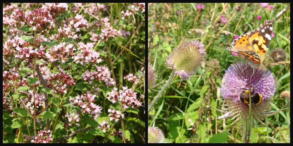 When the path drops down again to the burn the wooded valley opens out suddenly into a floodplain meadow, with grasses held well in check by abundant, parasitic Red bartsia. Where the burn finally disappears beneath a pile of accumulated mine spoil at the top of the beach we find a single, rather scrawny brooklime, Veronica beccabunga. The meadow itself, the short turf above the beach and the dry open slopes around, are alive with insects of all sorts – Teasels, Hemp agrimony and Wild marjoram in particular attract both bees and butterflies and stridulating grasshoppers provide the backdrop to our picnic. It seems a world away from the wildwoods of the upper dene.