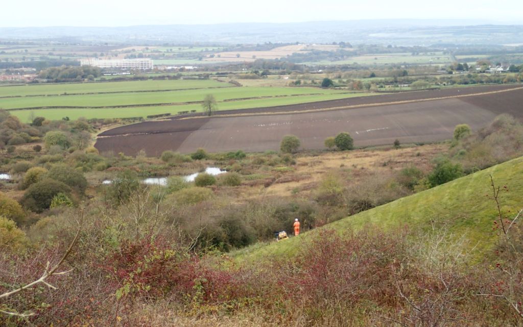 Yesterday’s attempt to look at what’s growing on the grassland being restored on recent quarry spoil at Quarrington Hill was both abortive and revealing, as the image below shows. The man in the high-vis outfit was running a robotic mower back and forth across the hillside! I didn’t feel I should be too obvious about photographing him and there seemed little point in looking at what was still flowering on the older spoil with nothing to compare it with.