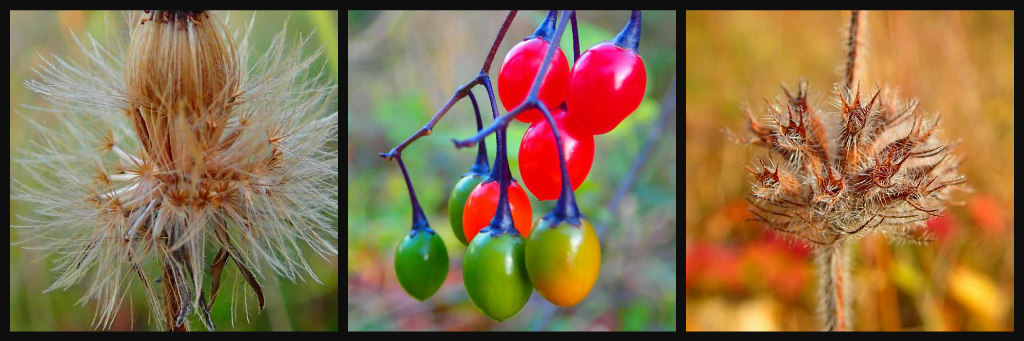 Left to right: Seed heads and fruits of Leontodon sp., Solanum dulcamara and Clinopodium vulgare