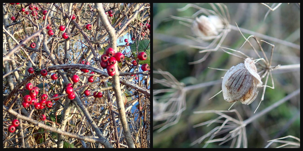 Elsewhere, it’s all about seeds and berries, being enjoyed by the flocks of Redwings and Long-tailed tits which scatter in the hedgerows ahead of me as I walk.