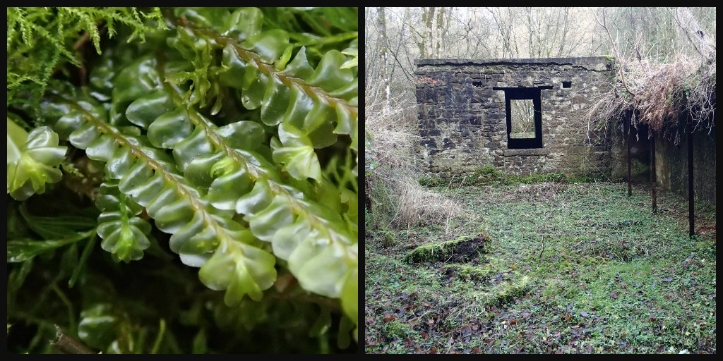 Five mosses seems like a reasonable tally for the day but we found a leafy liverwort too, Plagiochila asplenioides, growing on a dripping wall by the old rifle range. Bryophyte cousins of the mosses, leafy liverworts look pretty similar but have pairs of phyllodes with a smaller one beneath, rather than the spiral arrangement round a stem more typical of mosses.