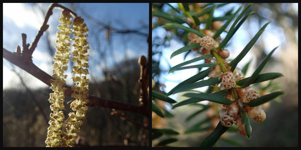 Signs of an early spring are everywhere – wild garlic shoots are pushing their way through the leaf litter, hazel catkins are sending out clouds of pollen and the ancient yew trees which are one of the features of the dene are covered in tiny flowers.