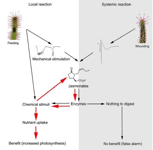 The involvement of jasmonates is strong evidence that carnivory evolved from plants’ need to defend themselves from insect attack. If the leaves are wounded mechanically to mimic a herbivorous attack, systemic electrical signals are produced, throughout the whole plant and jasmonates accumulate in the all leaves, triggering the expression of digestive enzymes. This seems a bit of a waste but is more evidence of the link between the pathways and, without the positive feedback loop shown above, the amount of enzyme produced will be limited.
