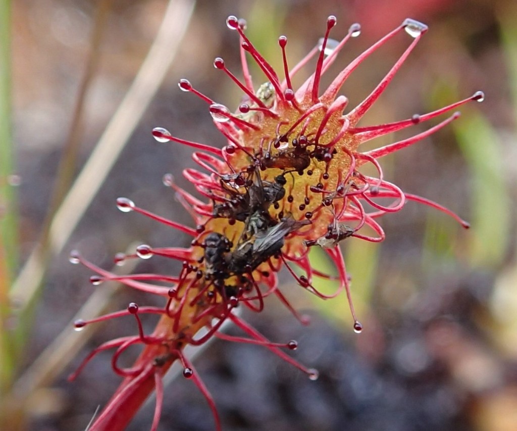 I’ve written about these fascinating plants before. They tend to grow in waterlogged environments where the recycling of mineral nutrients from decaying plant and animal material is limited by a lack of oxygen, so their options are limited. We often think of them as tropical plants – Venus fly traps or Pitcher plants, for example – but there are around a dozen species native to the UK. Charles Darwin was the first person to confirm that the Sundews he found on Sussex heathland not far from his home at Down House were using insects to meet their nutritional needs. Darwin’s book ‘Insectivorous Plants’, published in 1875, is a fascinating account of his experiments feeding all kinds of things, including raw meat and bits of hard boiled egg, to the plants and making the kind of detailed observations of their responses which you might expect of him.