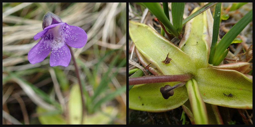 The Sundews we found were still in bud rather than in flower – both species produce spikes of small, white flowers held on long stalks, well above the leaves. Butterwort flowers are also on long stalks, making it frustratingly difficult to photograph the flower and leaves together! The reason quickly becomes apparent when you realise the flowers rely on insects to pollinate them – the plant needs a way of keeping those insects it requires for pollination safely away from its dangerous leaves.