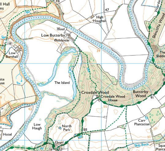 The farm at Low Butterby is well off the footpath but I was intrigued to see from the map it is marked as a having both a moat and gatehouse. Maybe I shouldn’t have been surprised – it’s obviously a fantastic defensive site as you approach Durham from the south, all but completely surrounded by the loop in the river. With its own additional moat, the medieval manor house of Butterby (a corruption of the original Beautrove) must have been more or less impregnable.