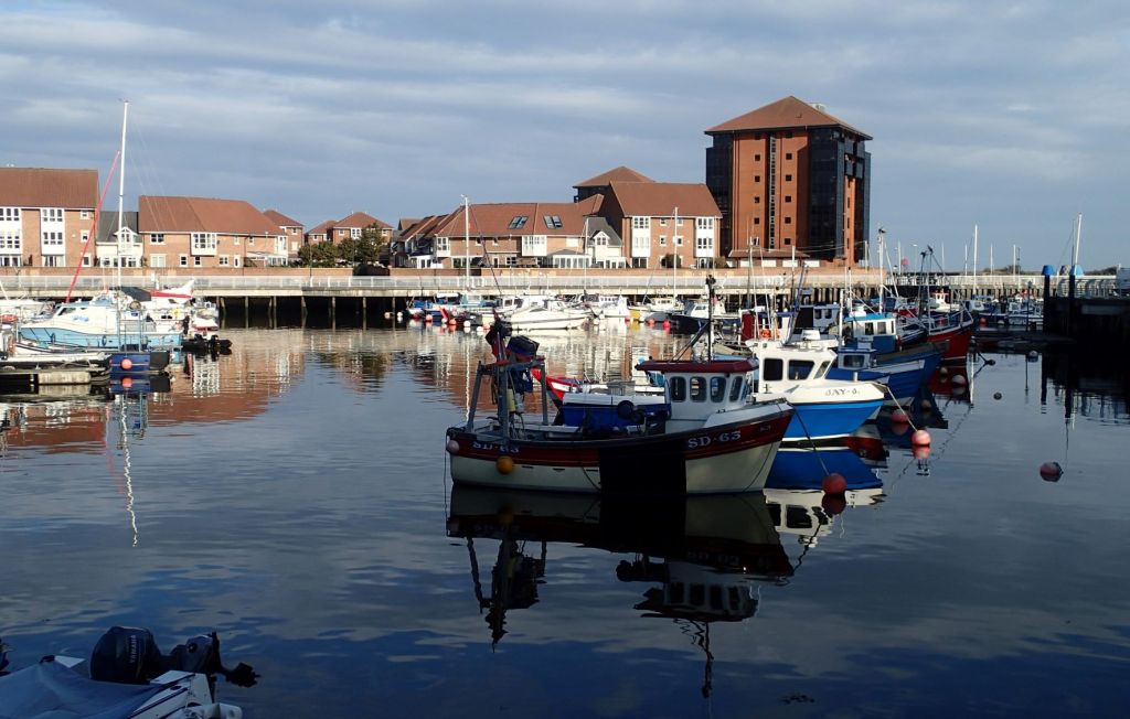 Once under the railway bridge a sculpture trail leads along the distinctly-gentrified north bank of the river towards the National Glass Centre. Sunderland has a long history of glass making, with the first stained glass in Britain made here in the late seventh century by French craftsmen brought in from Gaul. They made the windows for St Peter’s Church, the only part of the Wearmouth monastery still standing today. By 1860, more than 1000 workers were involved in the glass industry in Sunderland, working for some 20 different companies, and the beaches around here are good places to look for sea glass in novel colours – waste from the kilns as well as the usual fragments of bottles and jars. We are delighted to find the café at the Glass Centre is open for a restorative coffee before the final stretch along through the marina and out to the sea at Roker. The pleasure of walking on the beach and the brisk sea air makes us think we should be looking for a coastal walk to tackle next!