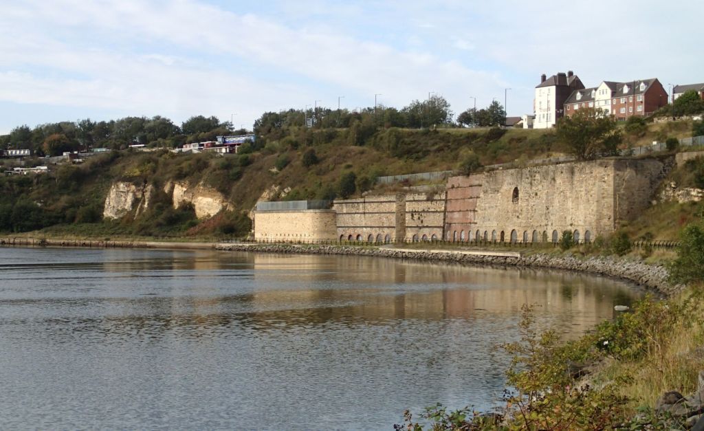 As we approach Monkwearmouth and the Stadium of Light, the route celebrates the region’s industrial heritage with a series of bronze interpretation panels on the limekilns lining the bend in the river and in the pavement, marking the site of the Wear Lime Works and Wearmouth colliery entrance and workings. The lime kilns were built into the sandstone cliff between 1821 and 1872, to process limestone brought by waggon from the quarry at Fullwell, a short distance to the north.