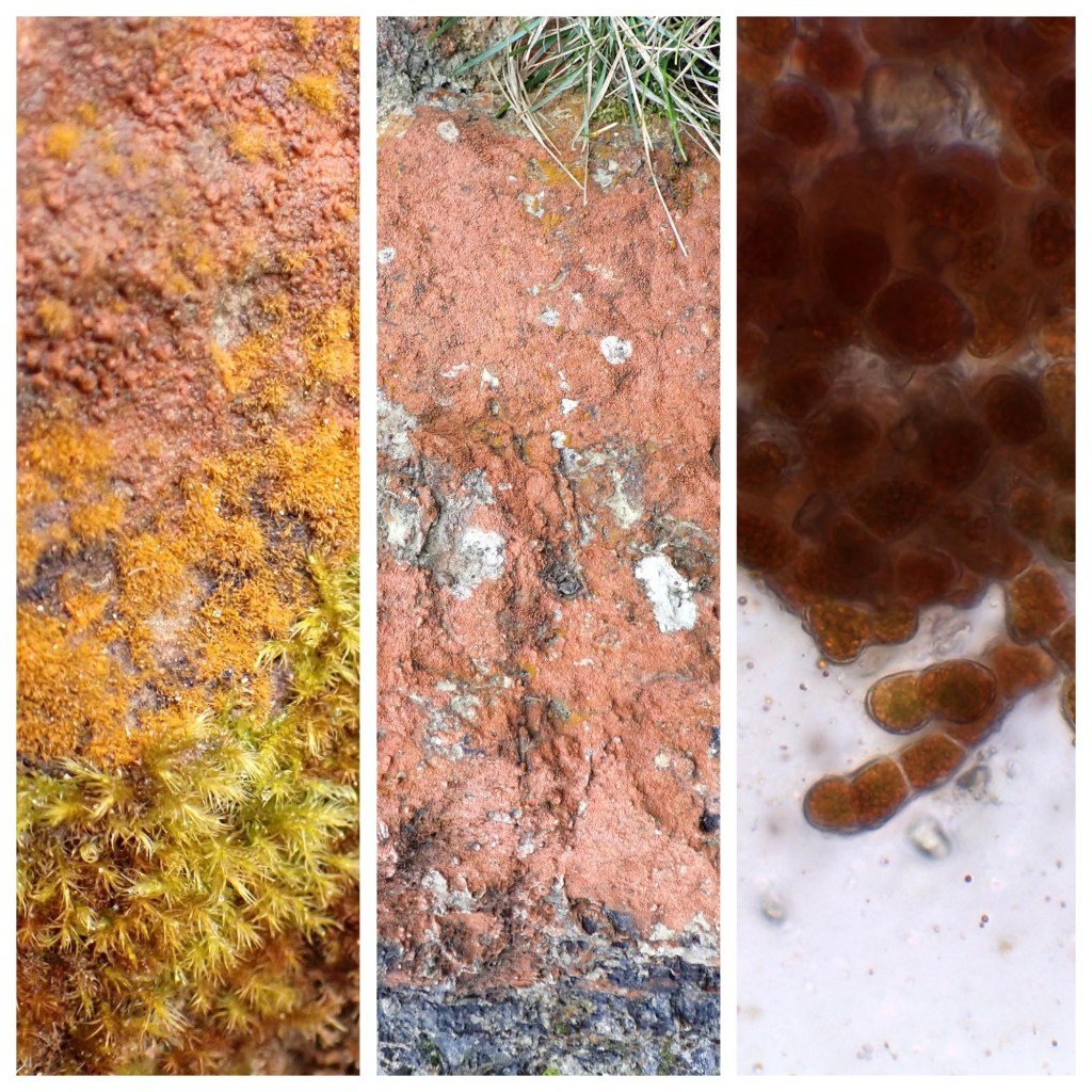 You can find out more about T. aurea and see micrographs of it for comparison in Martyn’s blog here. It turns out that Trentepohlia umbrina is an indicator of alkaline environments, and has been used to demonstrate the presence of alkaline dust pollution around quarries in Estonia (Marmor & Degtjarenko, 2014) so it’s in the right place!