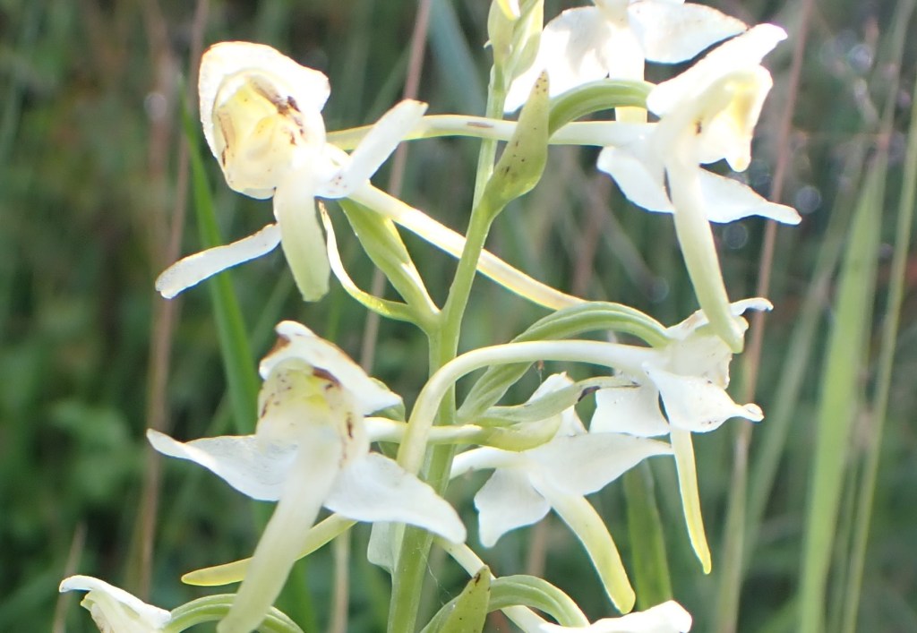 Greater butterfly-orchids differ from lesser ones (Platanthera bifolia) in having pollinia or pollen sacs which spread outwards from the tip to the base rather than lying parallel to one another along their length. The flowers are creamy white, tinged green, with a long, narrow lip and lobes which gives them a cross-shaped appearance. The really distinctive feature, and the clue to how they are pollinated, is the length of the nectar-filled spur behind each flower. Like a scaled-down version of Angraecum sesquipedale, which Charles Darwin famously used to predict the existence of a moth with a 35 cm long proboscis (Xanthopan morganii praedicta), this long spur suggests the orchid will only be pollinated by insects with a proboscis long enough to reach the nectar at the bottom. The flowers’ scent being strongest in the evening points to night-flying moths as the pollinators. Limiting the number of types of pollinators which can obtain nectar like this means that insects which collect the pollen are likely to visit other orchids of the same species, improving the chances of successful pollen transfer and cross-fertilisation.