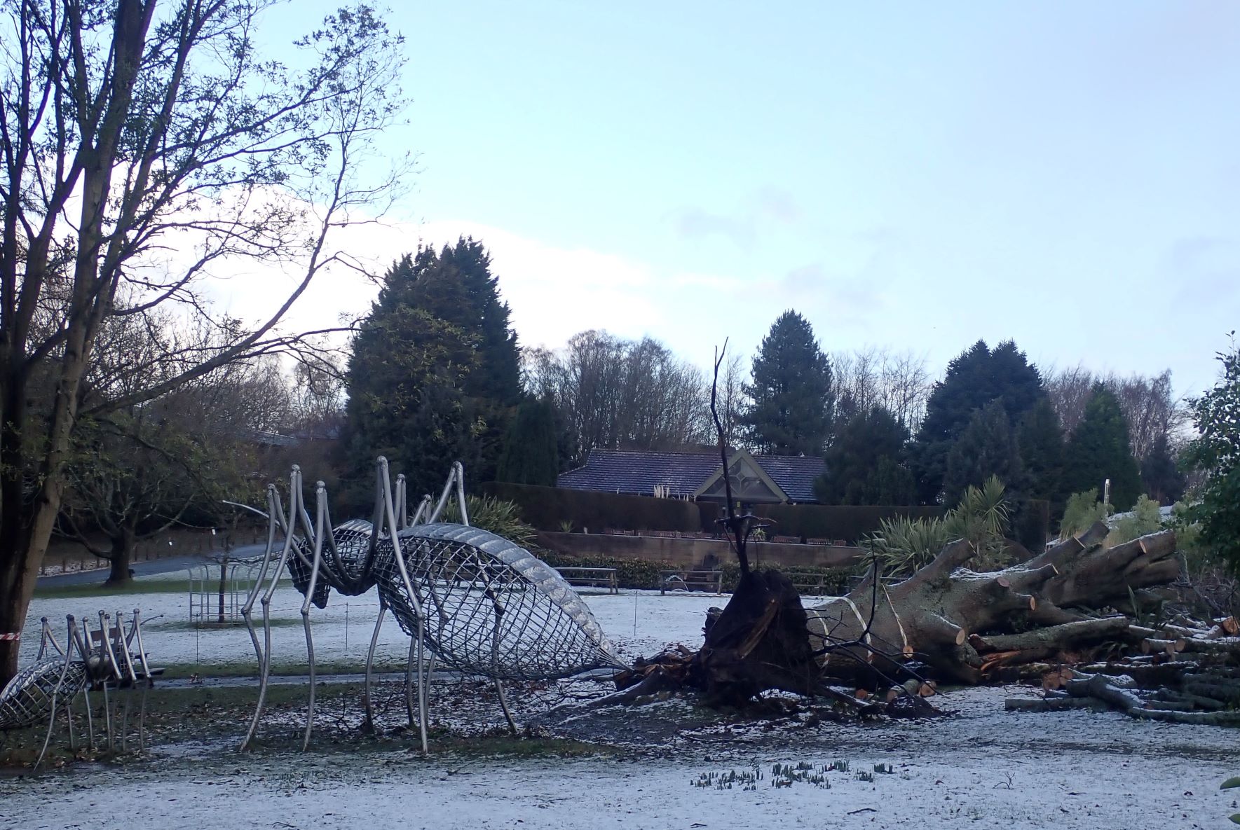 Another month into the new year and there are many more signs of spring in the Botanical Gardens. I’m fortunate to visit in the lull between storms Dudley and Eunice on a cold, bright, blustery morning but there is plenty of evidence of the damage caused by storm Arwan before Christmas and Corrie and Malik last month. Maybe the saddest casualty is the large oak near the alpine garden, which developed a crack across its based after storm Arwan and was felled altogether by Corrie and Malik. Maybe I’ve been watching too much Green Planet but it looks to me like the giant insect sculptures in the garden are dragging it away to their nest!