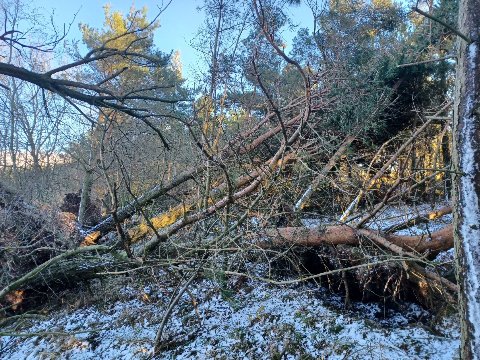 Fallen trees can enhance biodiversity because the extra light available allows younger trees to grow up fairly quickly and plug gaps in the canopy. At the lovely Tentsmuir Forest in north-east Fife, the plan is to replant with a mixture of bushes, rowan trees, oak and Scots pine rather than just pine. This will have the dual benefit of offering may more habitats for other organisms and meaning that, should one tree fall, it is less likely to take all its neighbours with it. In addition, if the urge to tidy up every fallen tree can be resisted, dead wood left on the ground will provide a habitat and food for fungi and a wide range of invertebrates, birds and bats for many years.