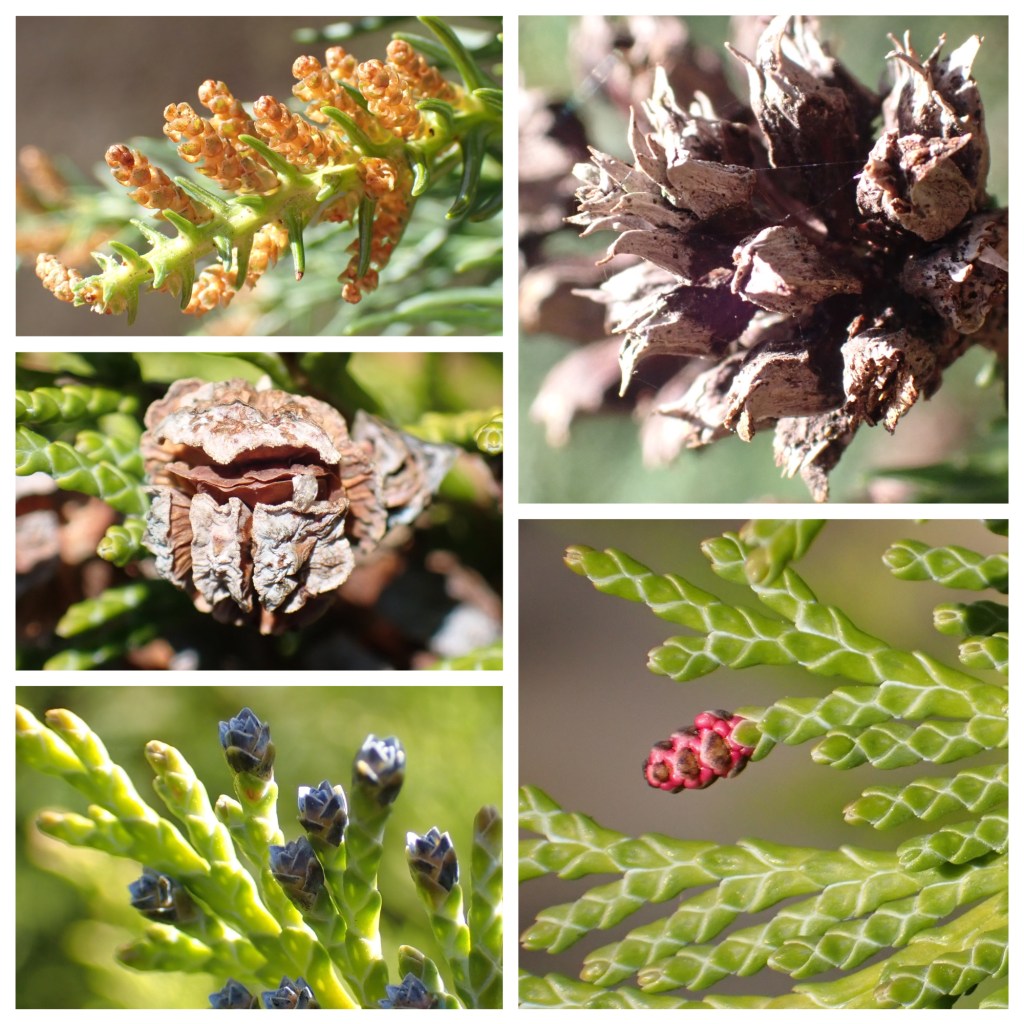 The name gymnosperm means ‘naked seeded’; the plant’s ovules and seeds are not protected by an ovary or fruit as they are in the flowering plants (angiosperms) but are held on the scales of the maturing female cones. Because gymnosperms evolved long before insects were available for pollination, they rely on wind to carry pollen grains from the male to the female cones, so generally produce vast quantities of very light pollen. You can see clouds of it if you tap a male cone on a warm sunny day at this time of year – a hayfever sufferer’s nightmare! The whole process is much slower than in the flowering plants, taking up to two and a half years from pollination of the young female cone to the point where the cone dries out and sheds its seeds.